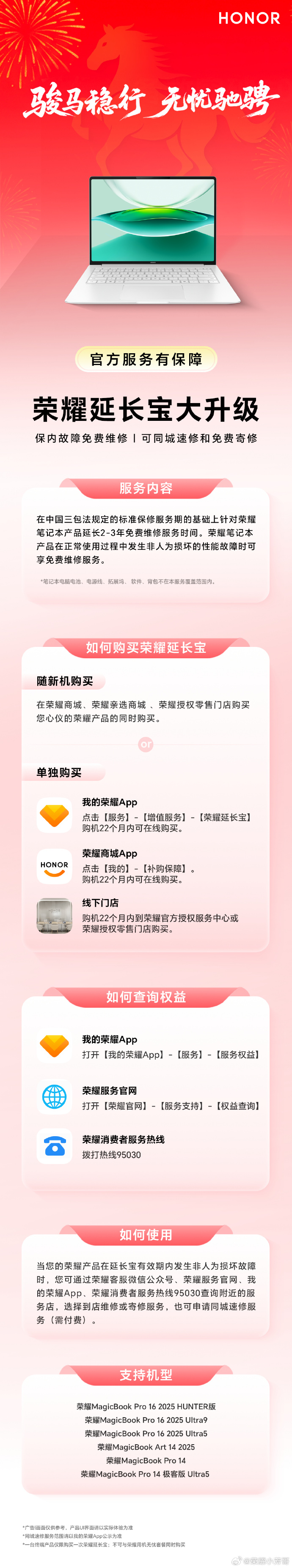 2026年新春期间,荣耀颁布发表严沉办事升级,针对旗下六款抢手笔记本机型推出耽误宝办事优化,将原有的1年免费维修期耽误至2-3年,本次办事升级笼盖六款具体机型,本次福利笼盖六款笔记本产物。2026年新春期间,荣耀颁布发表严沉办事升级,针对旗下六款抢手笔记本机型推出耽误宝办事优化,将原有的1年免费维修期耽误至2-3年,提拔用户售后保障体验。